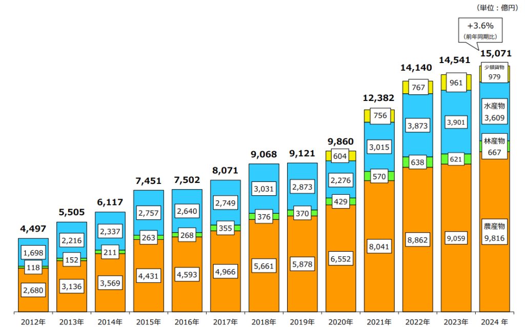最新の政府統計(農林水産省)より、輸出額は 10年で約2倍以上 に伸びています。