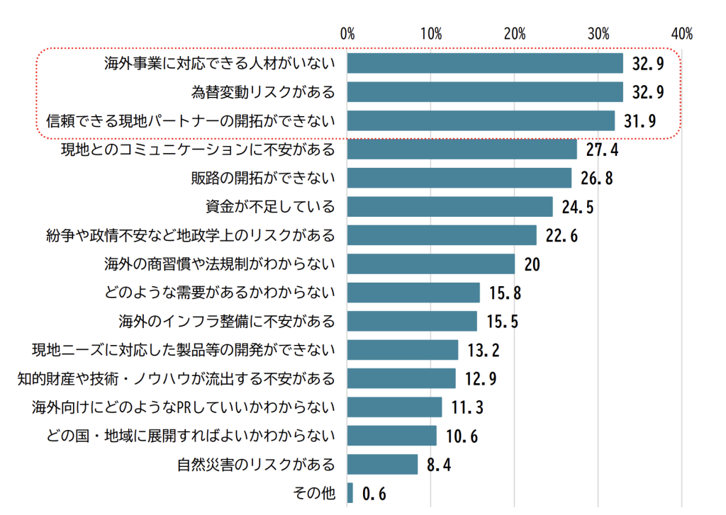 中小企業を対象とした調査では、海外展開における課題として「海外事業に対応できる人材がいない」ことを挙げる企業が最も多く、為替変動リスクや、信頼できる現地パートナーの開拓ができないことも、主要な課題として示されています。